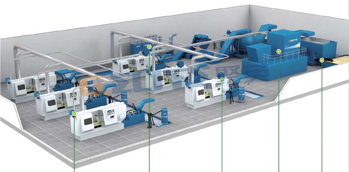 多工位集中油霧凈化治理適用于機(jī)床數(shù)量規(guī)模較大,或者多臺(tái)、多種類型開放式機(jī)床,通過(guò)吸氣罩或吸氣臂形式收集油霧氣體,并且有條件設(shè)置排氣筒的情況,前端收集油霧氣體,通過(guò)管道集中輸送到凈化主機(jī)中過(guò)濾凈化后,通過(guò)風(fēng)機(jī)和煙囪潔凈空氣排入大氣
